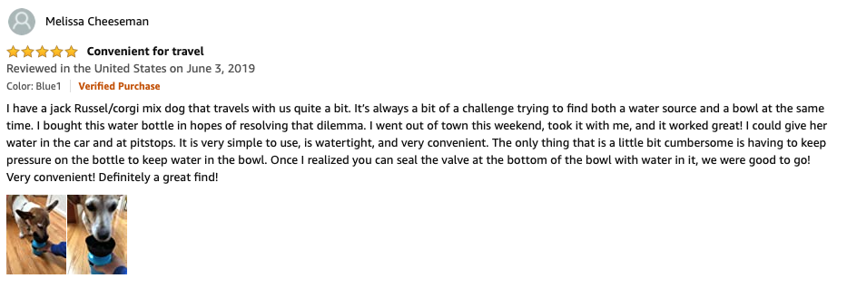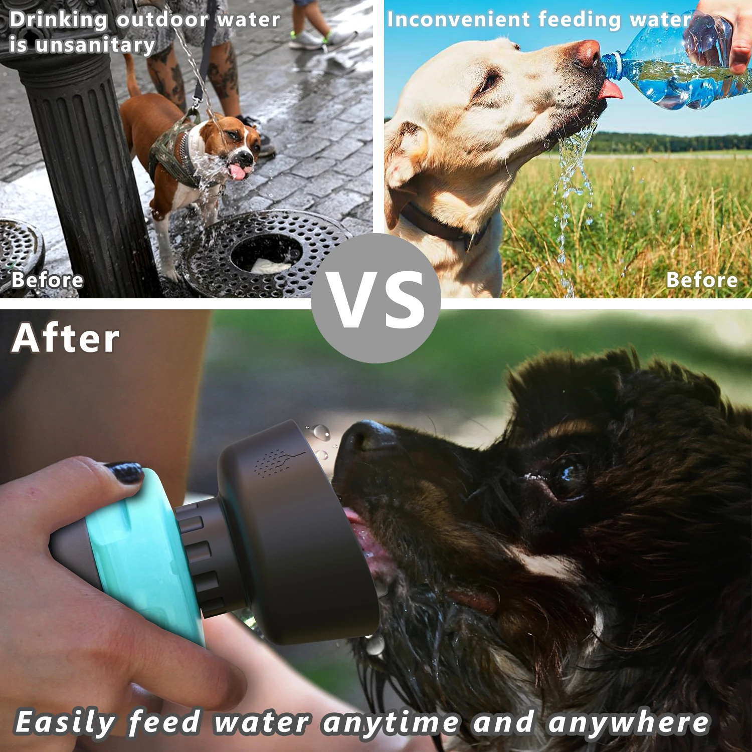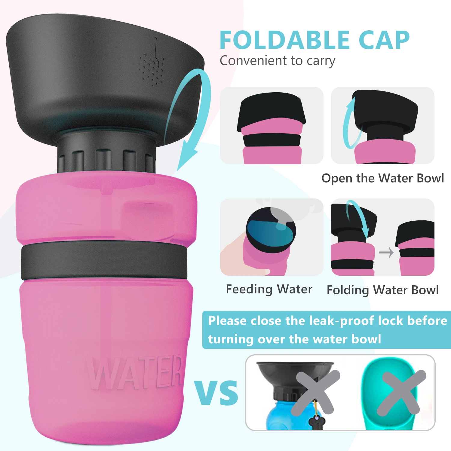 ASY to USE : Exclusive patented design,according to other brands improvement, dog water bottle and water bowl two in one. The fold cap becomes a water bowl , no extra bowls required. Squeeze the water bottle with one hand and the water will flow into the bowl. Fold back after drinking.